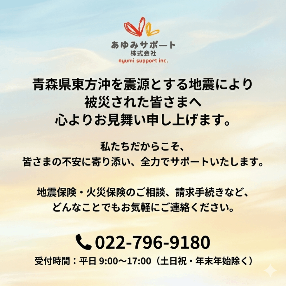 青森県東方沖地震で被害に遭われた皆さまへ |心よりお見舞い申し上げます