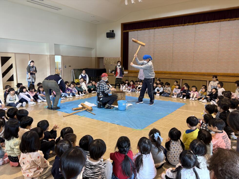 1月9日(金)、臼と杵を使って、餅つきを行いました。 餅つきを始める前に、蒸しあがったばかりのもち米を見ました。 白米ともち米の違いはどこかな?餅つきへの期待は高まります♪ 最初は園長先生やバスの先生…