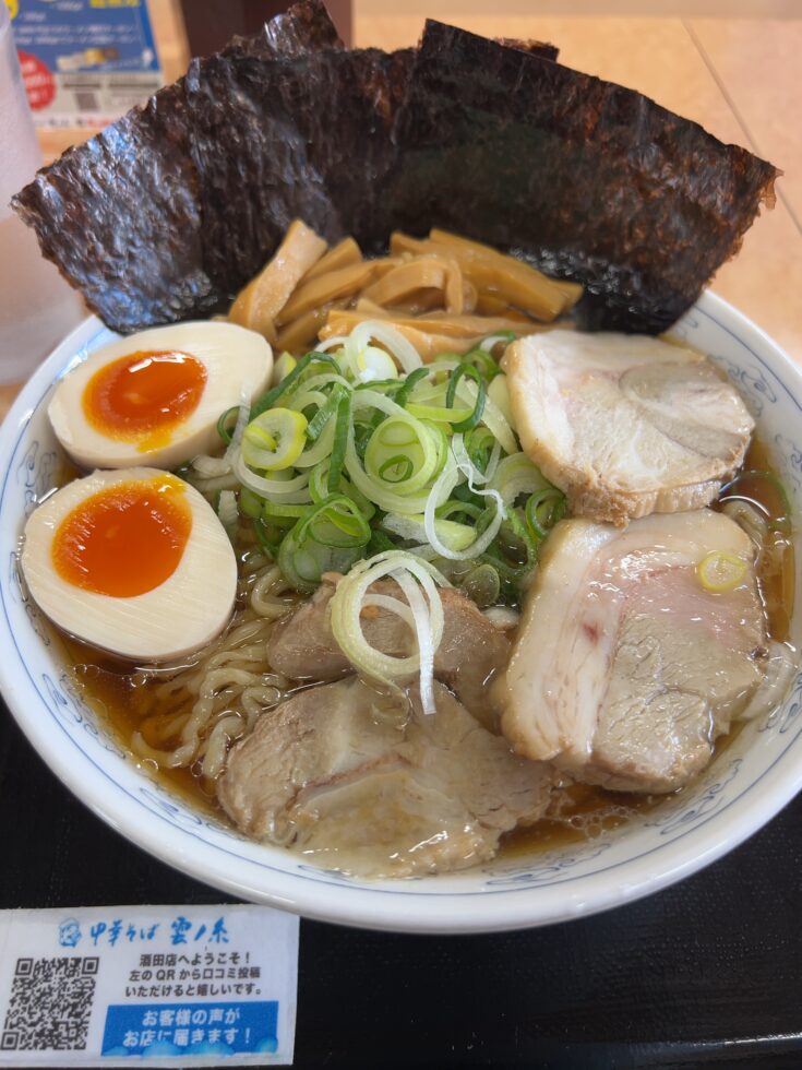 今日は、昨日ほど忙しくない🎵 少しだけゆとりがあるので、お昼ご飯にもゆとりを。 そこで、こちら🎵 「中華そば雲ノ糸」さんで、特製中華そばを頂きました!! 健康を考え、普通盛り。 健康を考え、トッピング…