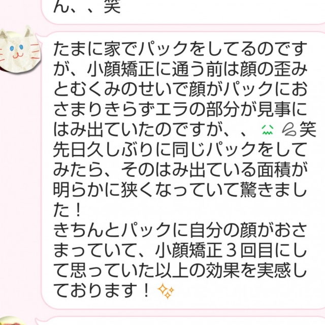 鶴岡市 M.Iさん 30代 女性 メニュー:小顔美顔矯正 たまに家でパックをしてるのですが、小顔矯正に通う前は顔の歪みとむくみのせいで、顔がパックに…