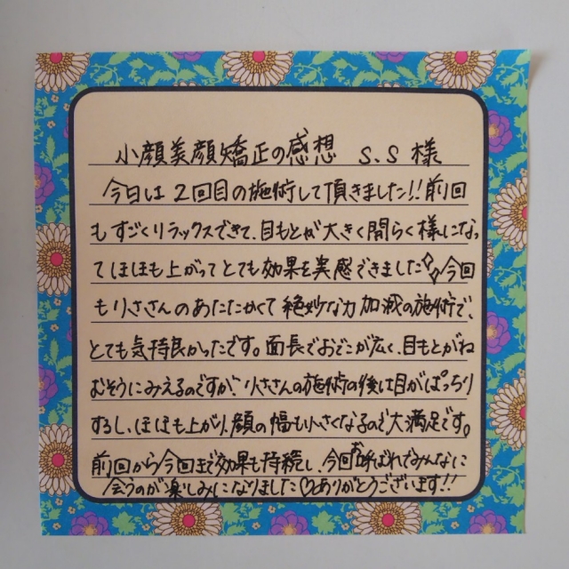 鶴岡市 S.Sさん 20代 女性 メニュー:小顔美顔矯正 今日は2回目の施術して頂きました!!前回もリラックスできて、目もとが大きく開く様になって、…