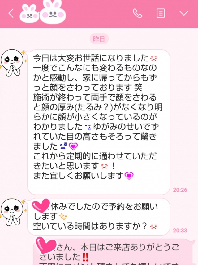 鶴岡市 M.Iさん 30代 女性 メニュー:小顔美顔矯正&石膏炭酸パック ご新規お客様から、とても嬉しいラインを頂きました✨&…
