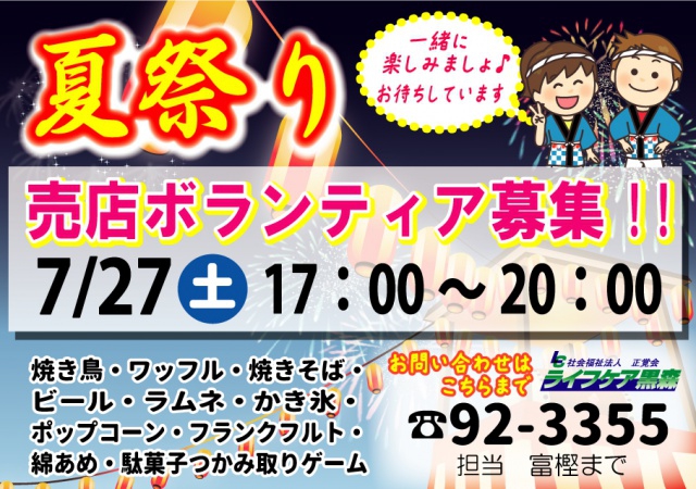 ボランティアとして夏祭りに参加してくださる方を募集しております。