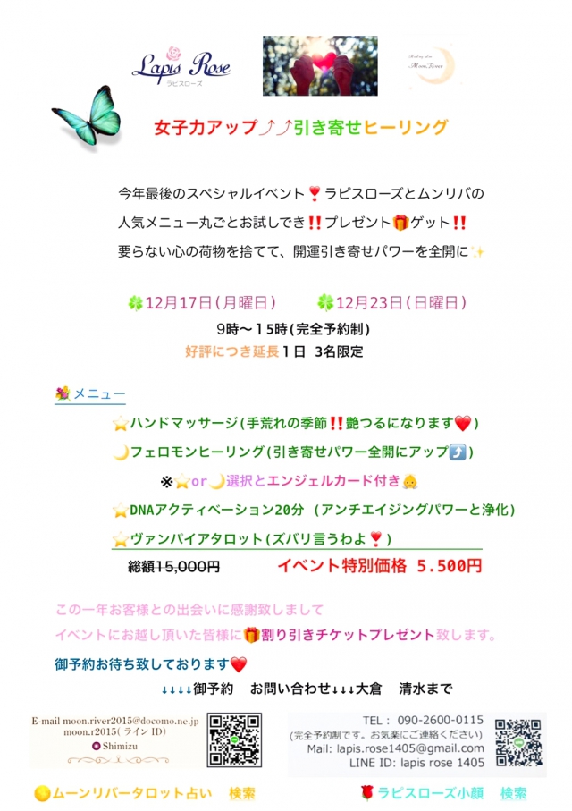 12月6日より、フェロモンアップヒーリングの価格が変わり、内容はより充実したヒーリングになります✨ そして、Lapis Roseのイチオシヒーリングメニューになります❤️ フェロ…