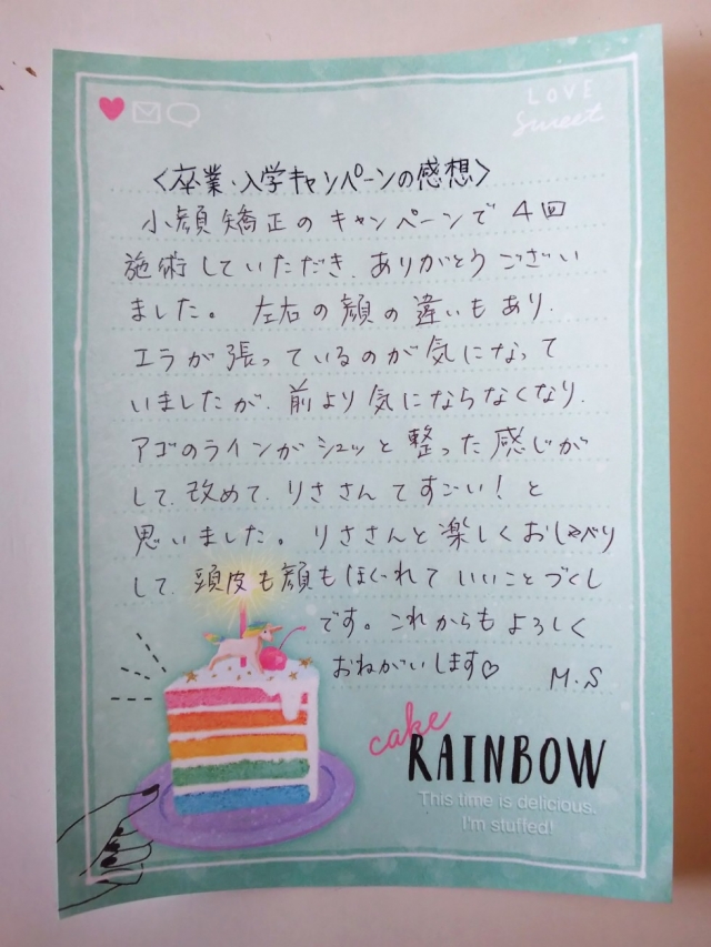 酒田市 M.Sさん 40代 女性 メニュー:卒業・入学キャンペーン 小顔矯正のキャンペーンで4回施術していただき、ありがとうございました。 左右の顔…
